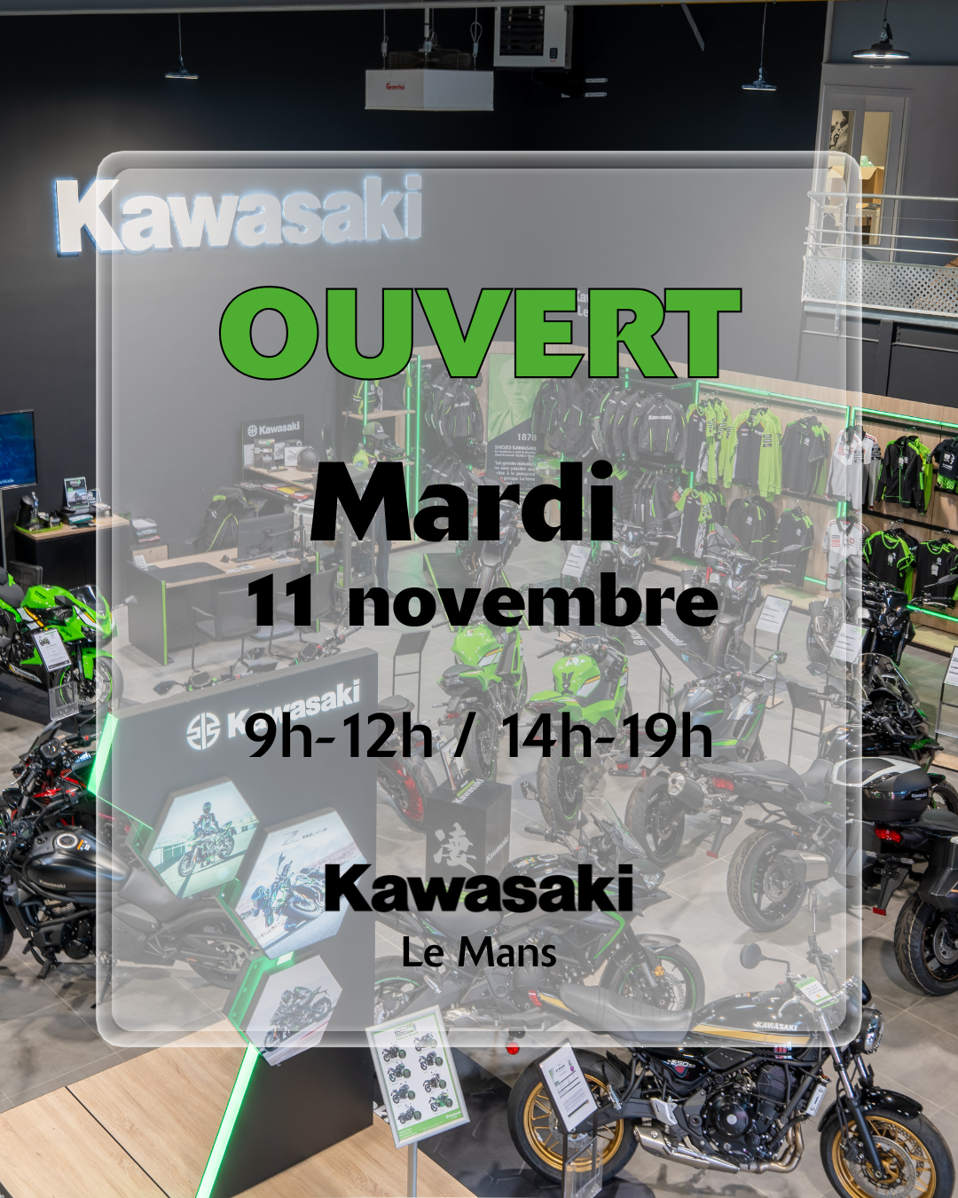 Votre concession Kawasaki Le Mans sera ouverte le Mardi 11 novembre 2025 de 9h à 12h et de 14h à 19h.Venez découvrir l’univers vert et les dernières nouveautés de la gamme !